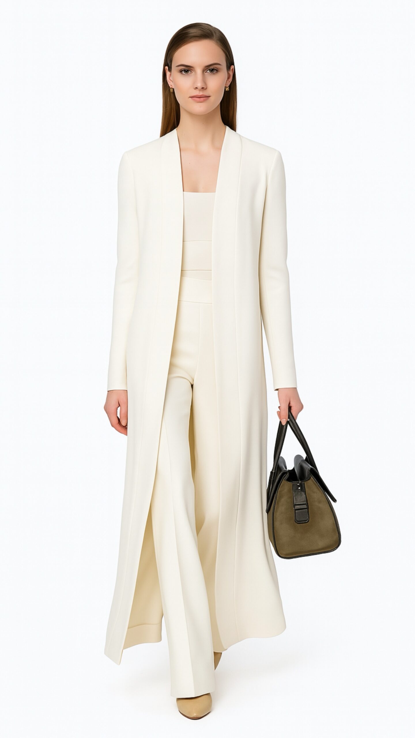 The creamy ivory tone enhances its luxurious appeal, making it a versatile piece for monochrome looks or neutral layering. Styled with coordinated trousers and a structured top, this look speaks to the woman who leads with elegance and clarity.