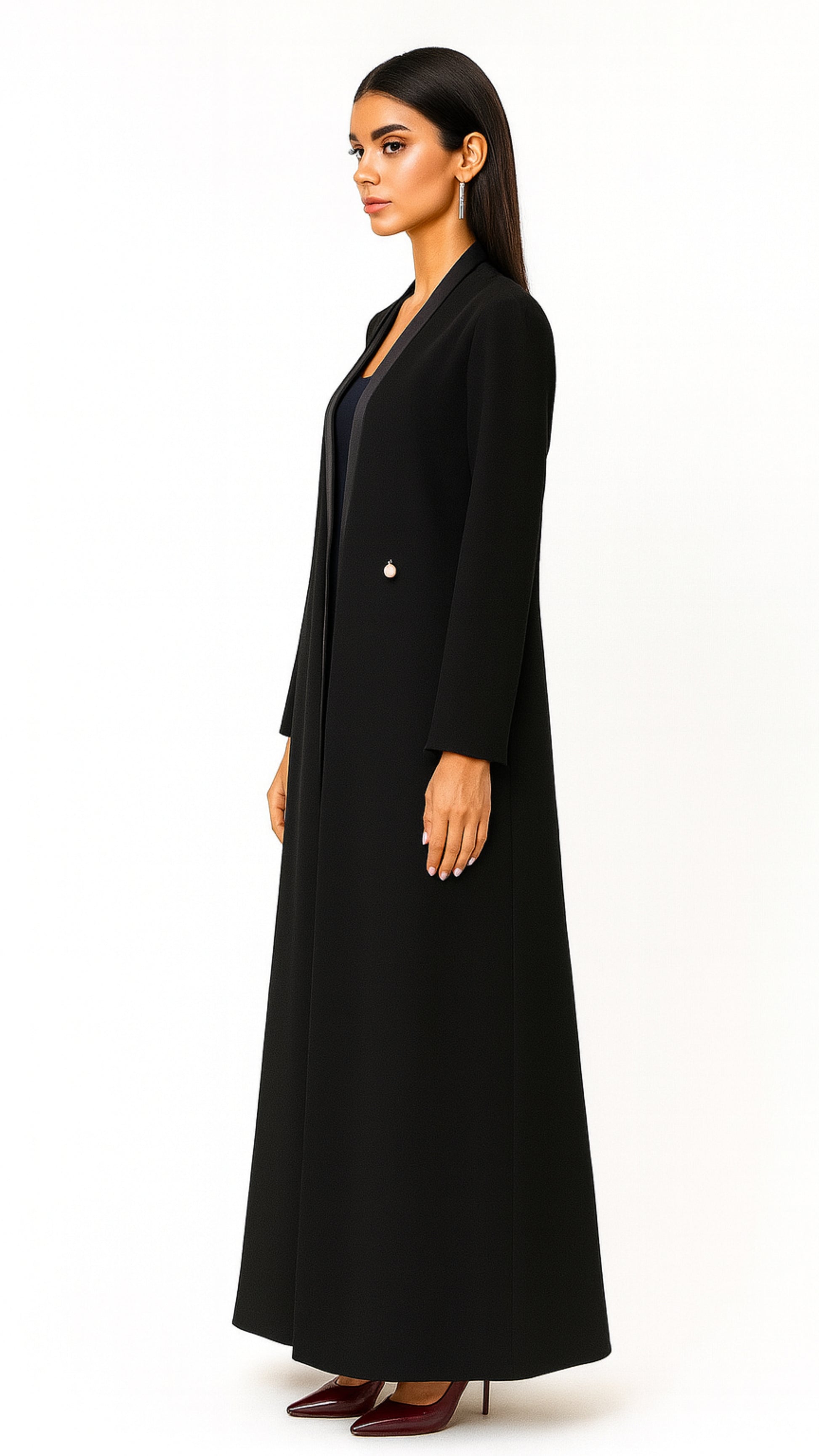 Timeless, graceful, and effortlessly refined — the Noir Pearl Abaya is designed to embody quiet luxury. Its flowing silhouette is elevated with a sleek satin lapel and adorned with delicate pearl button details, striking the perfect balance between modern tailoring and classic modesty. This abaya transitions seamlessly from day sophistication to evening elegance, making it a wardrobe essential for the discerning woman.
