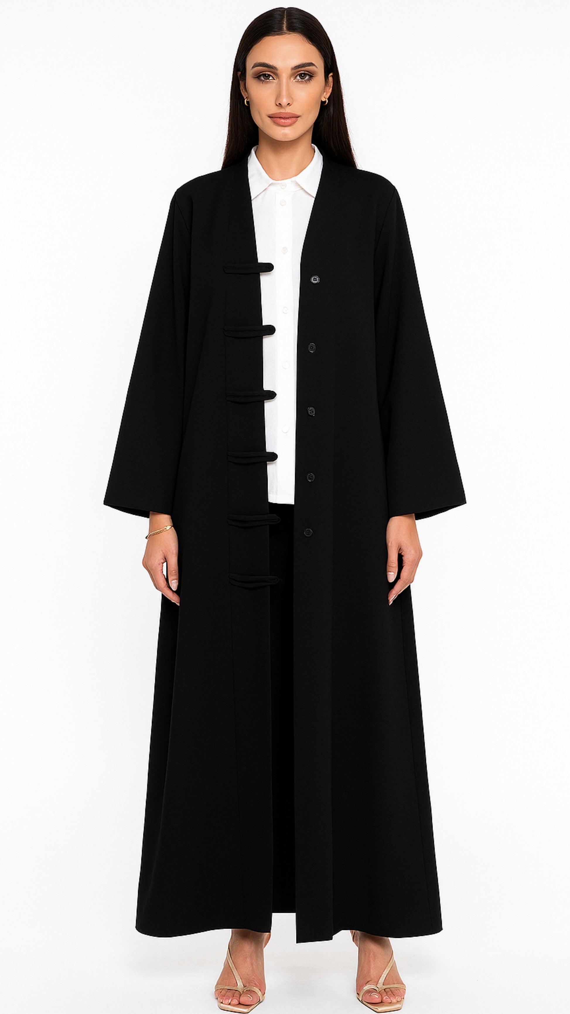 A refined fusion of classic modest wear and subtle Eastern influences, the Noir Oriental Closure Abaya delivers sophistication with a touch of heritage. Crafted in a straight, full-length silhouette, it offers a graceful drape and a timeless, minimal aesthetic.