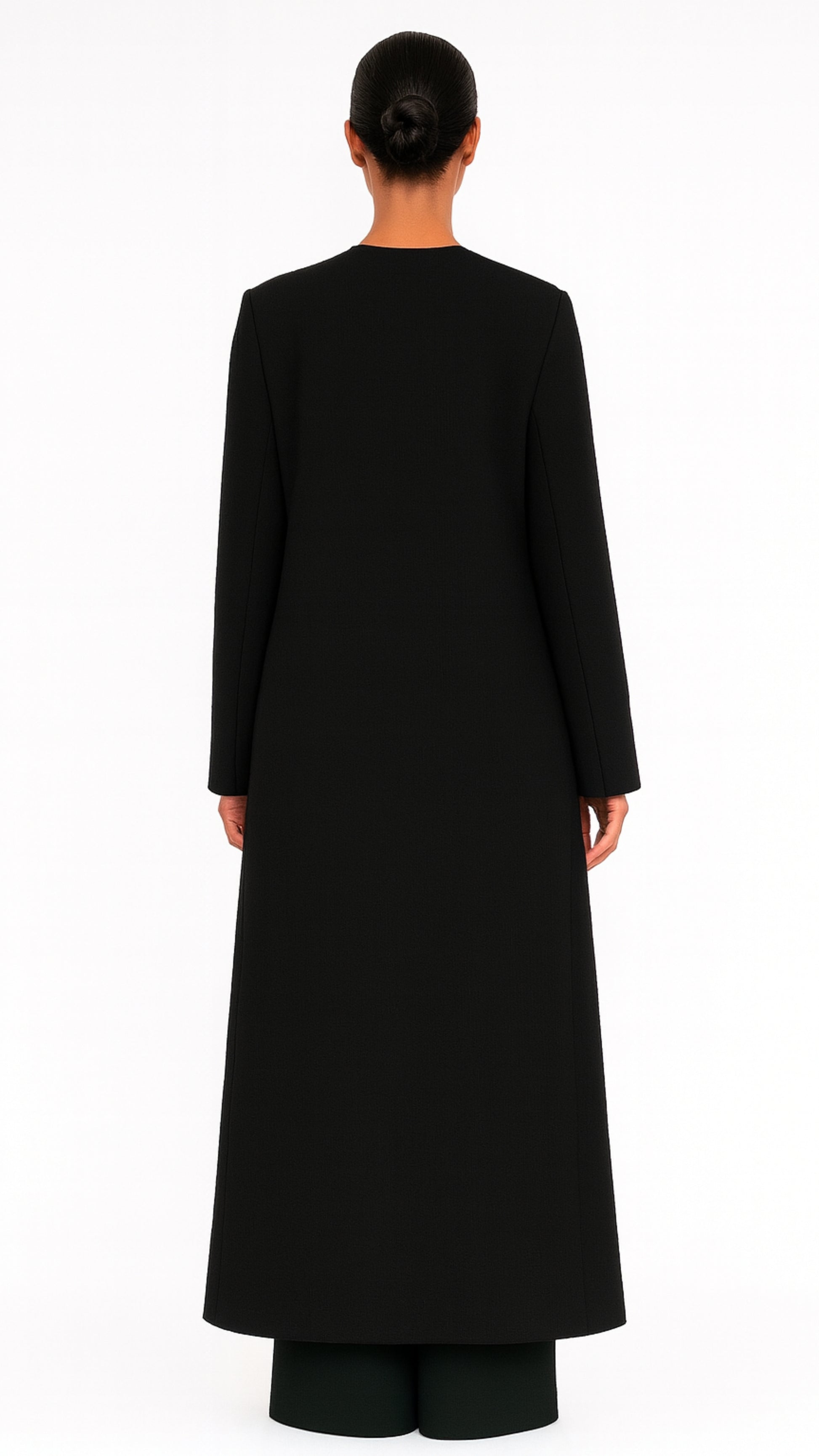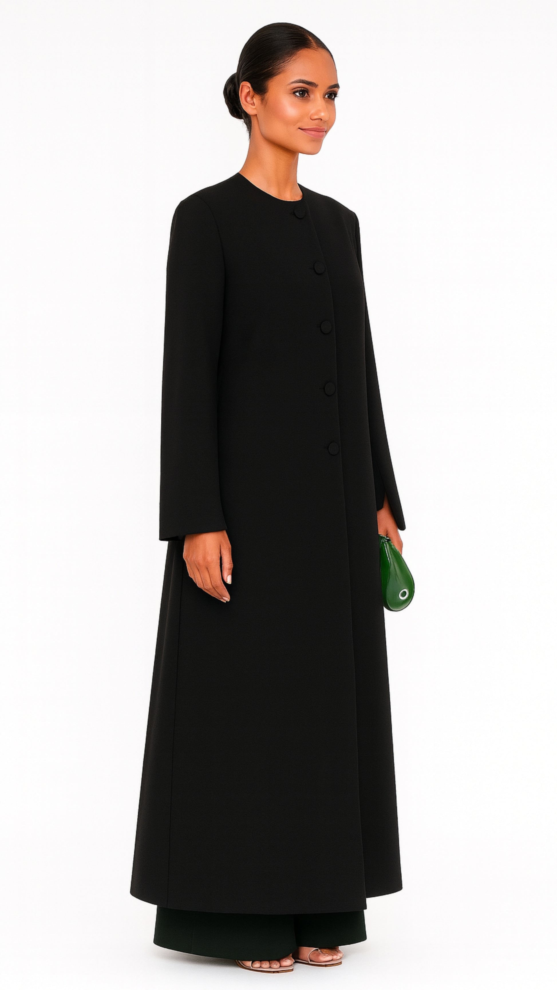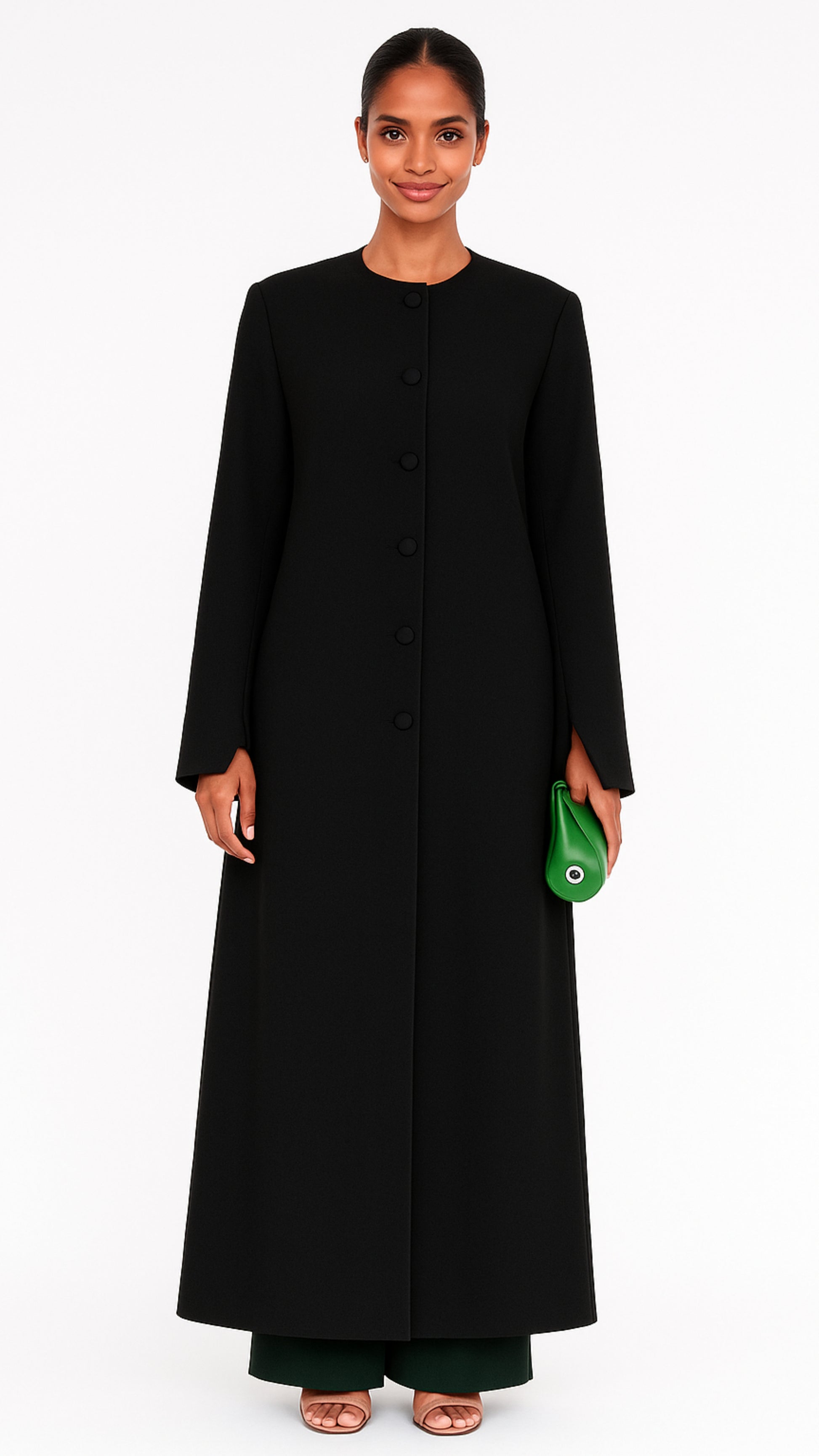 The minimalist design allows the tailoring to take center stage, with long, smooth sleeves and a gently flared hemline that moves gracefully. Perfect for pairing with statement accessories or keeping sleek and monochromatic, this abaya adapts effortlessly to any occasion.