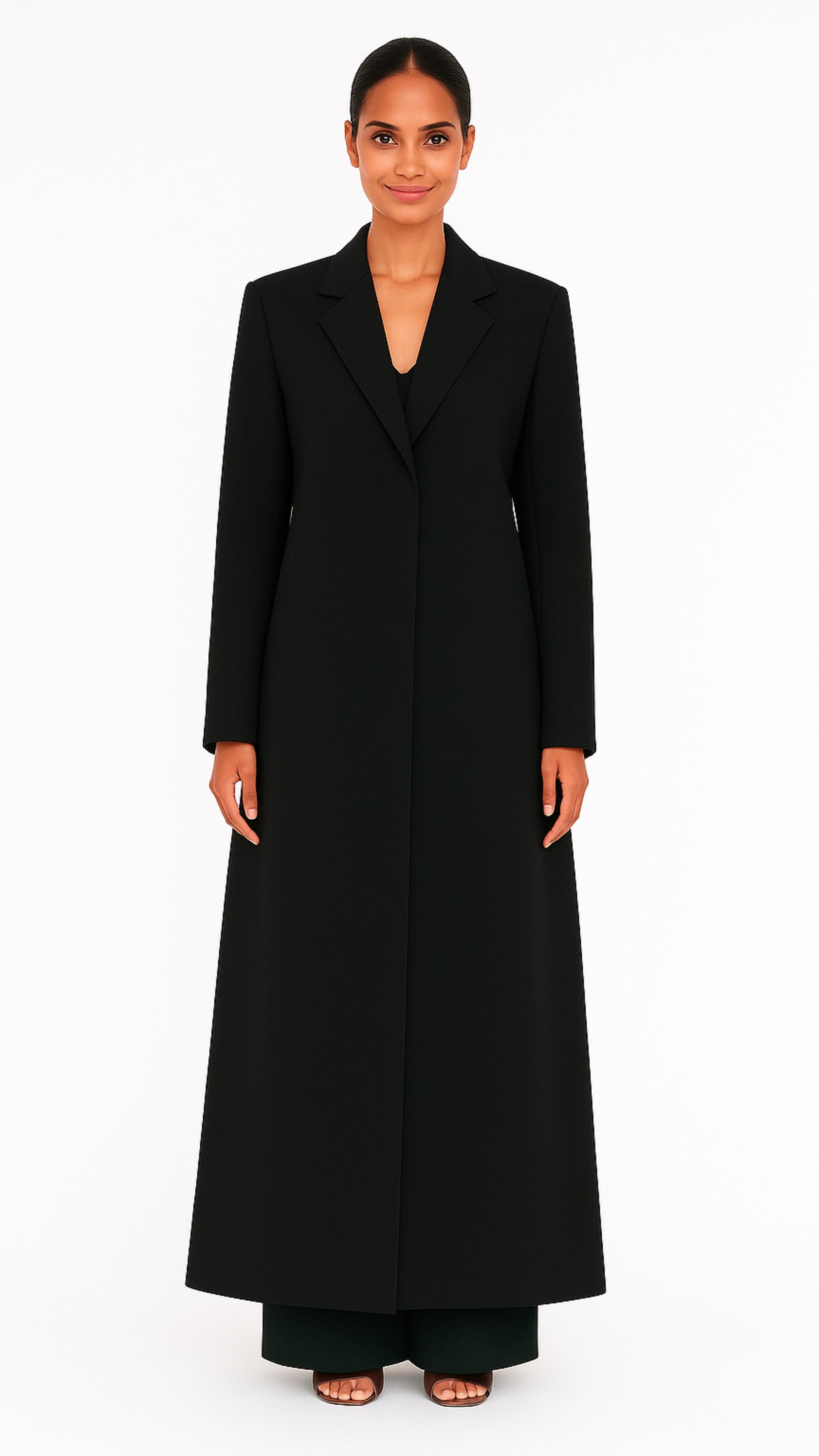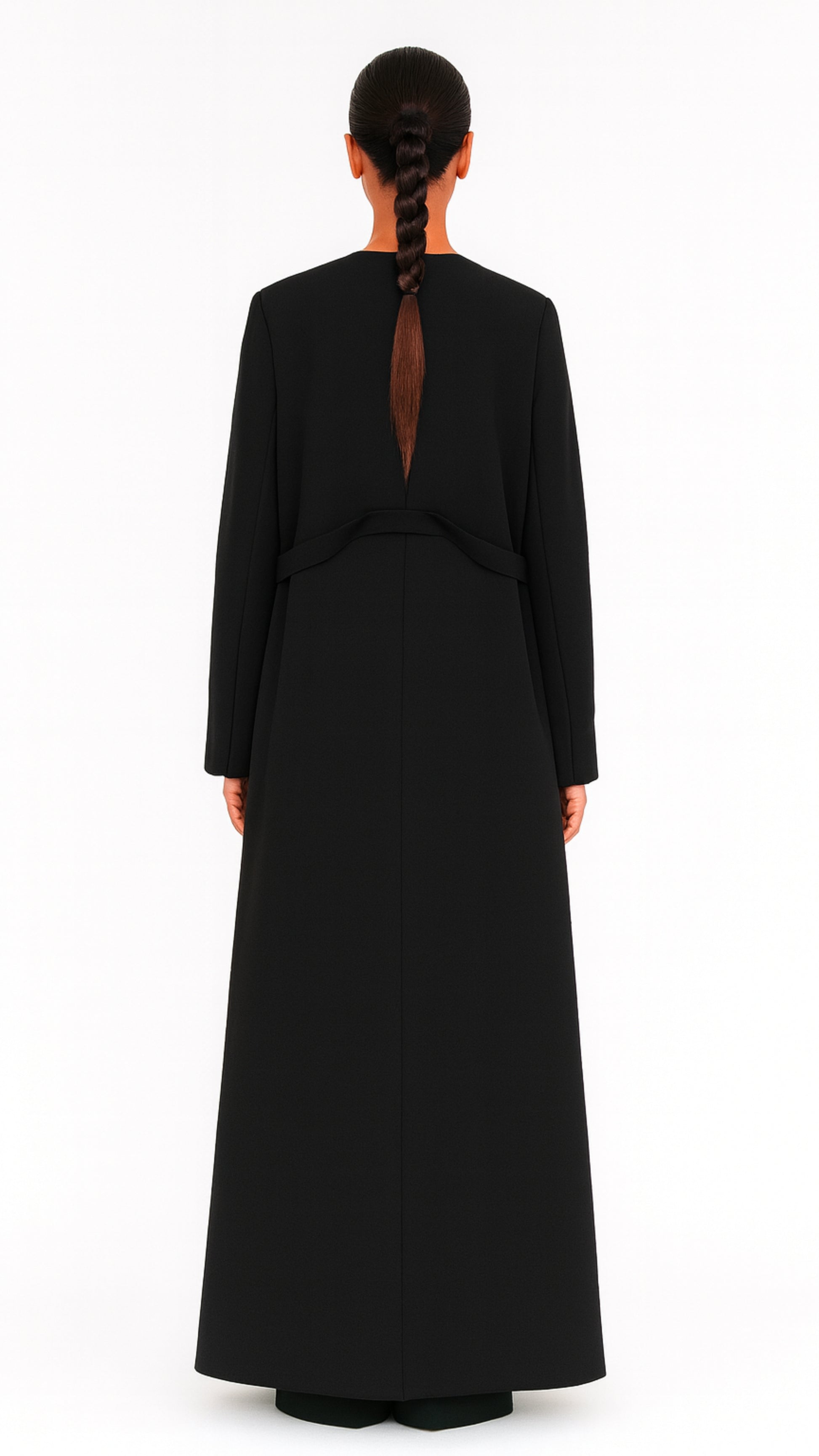 The full-length fitted sleeves and slightly flared hemline create a balance between structured form and graceful movement. Perfect for professional settings, formal gatherings, and elegant evenings, this abaya is a modern classic for the confident woman.