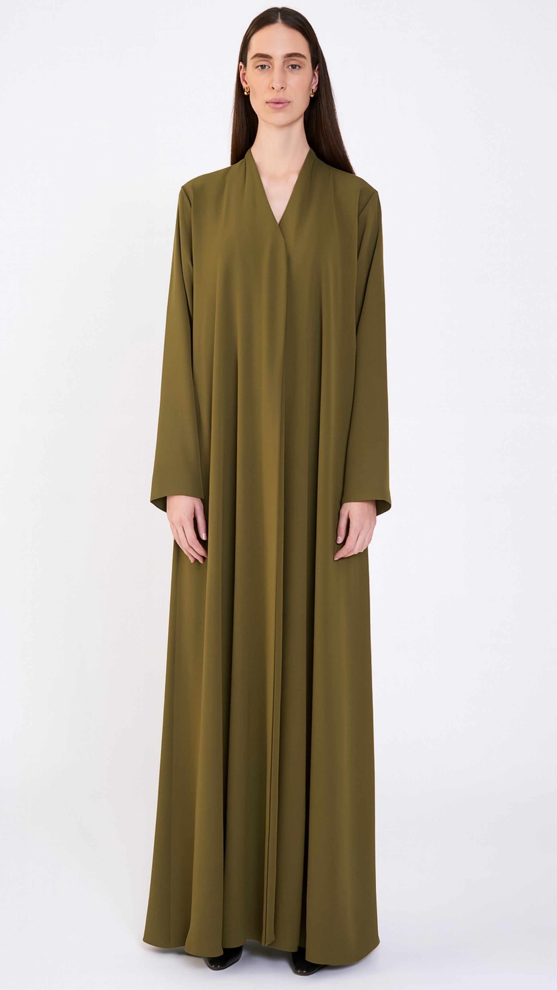 Crafted from premium lightweight crepe, the rich olive green hue brings a refined, earthy sophistication that transitions seamlessly from daywear to evening occasions. The minimalist V-neckline frames the face elegantly, while the absence of embellishment keeps the focus on the abaya’s clean lines and beautiful drape.