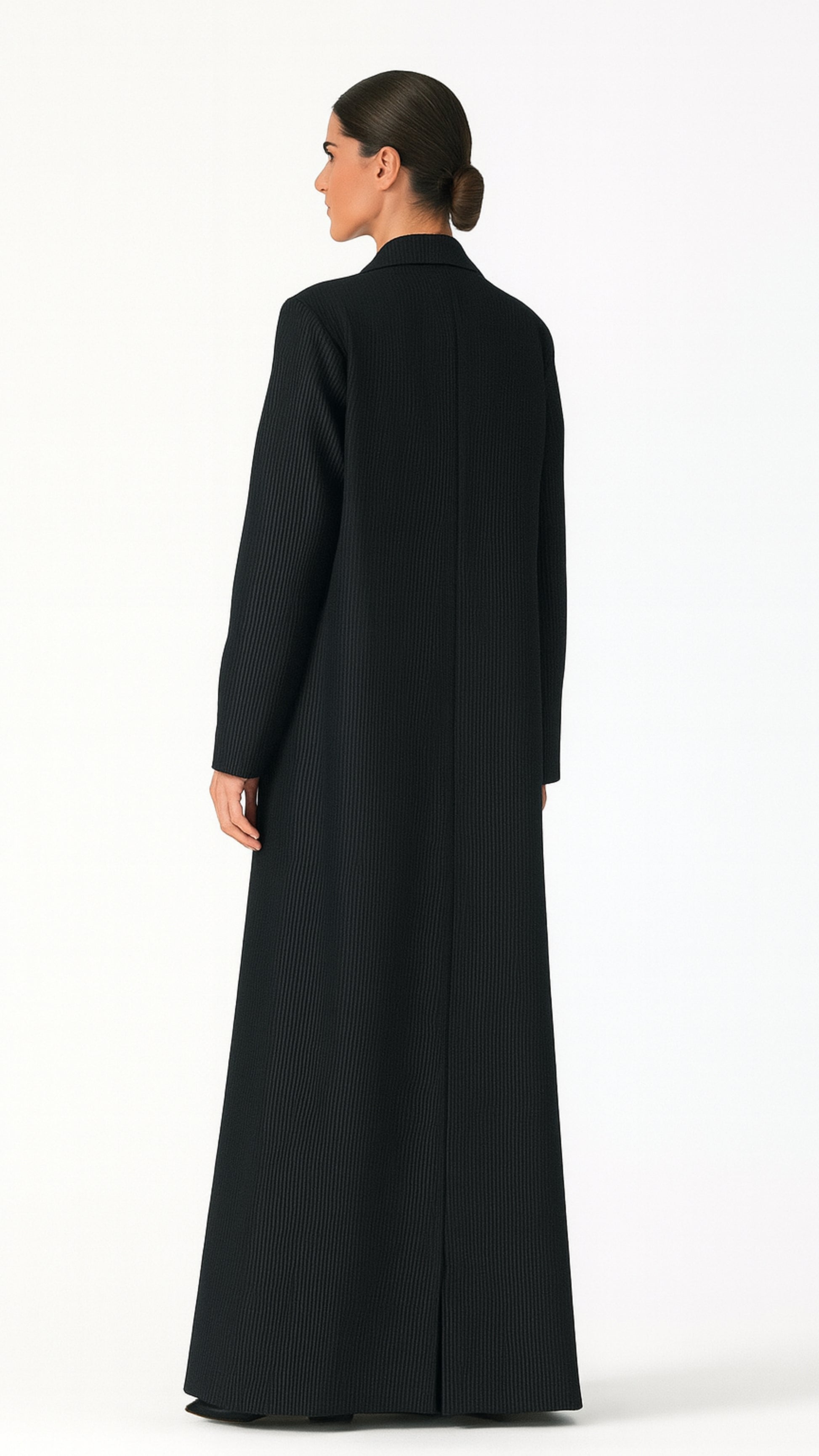 The long, fitted sleeves are finished with functional button cuffs, adding a refined touch of classic tailoring. The elongated silhouette not only flatters but also makes a commanding presence in both formal and high-fashion settings.