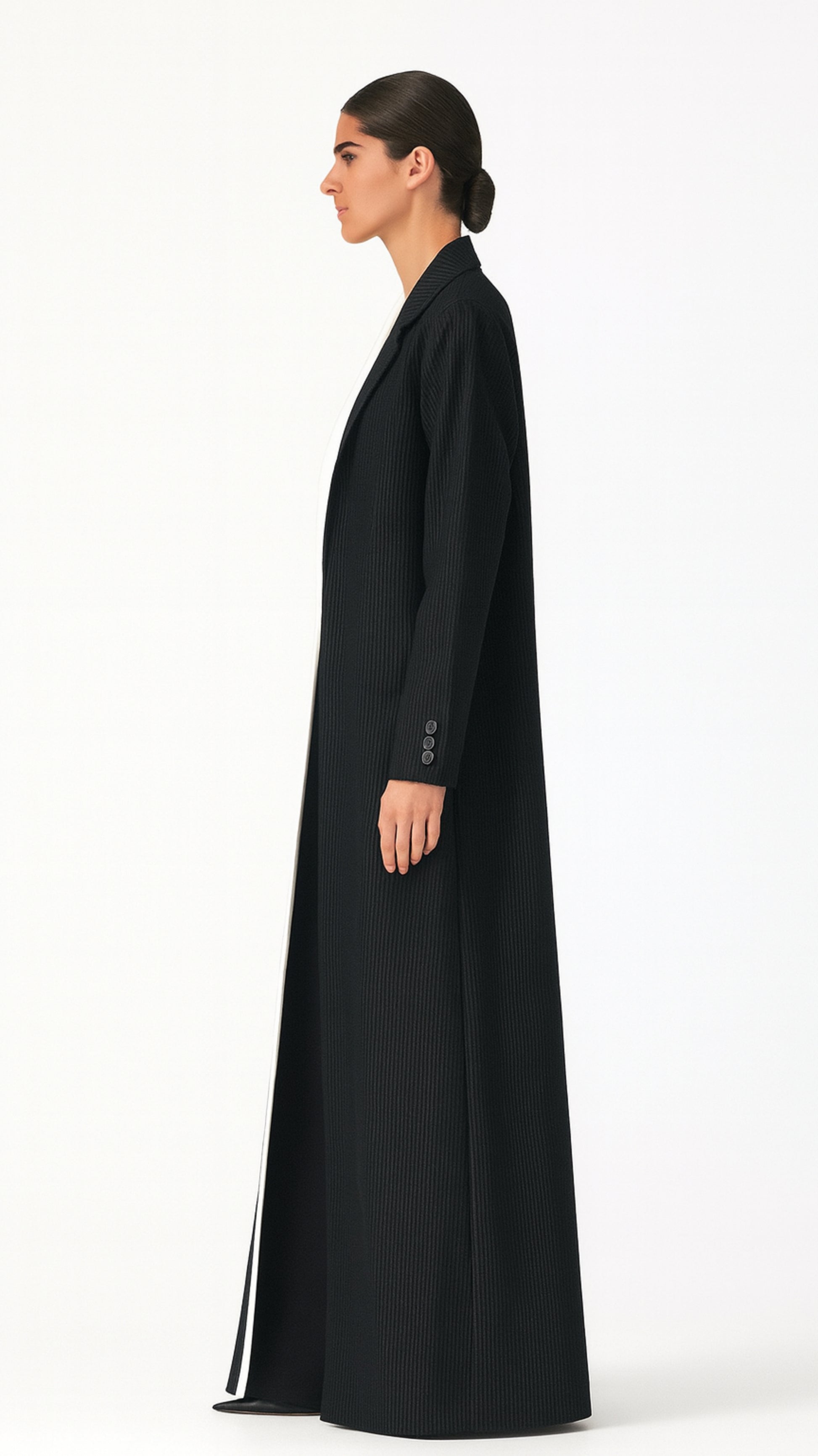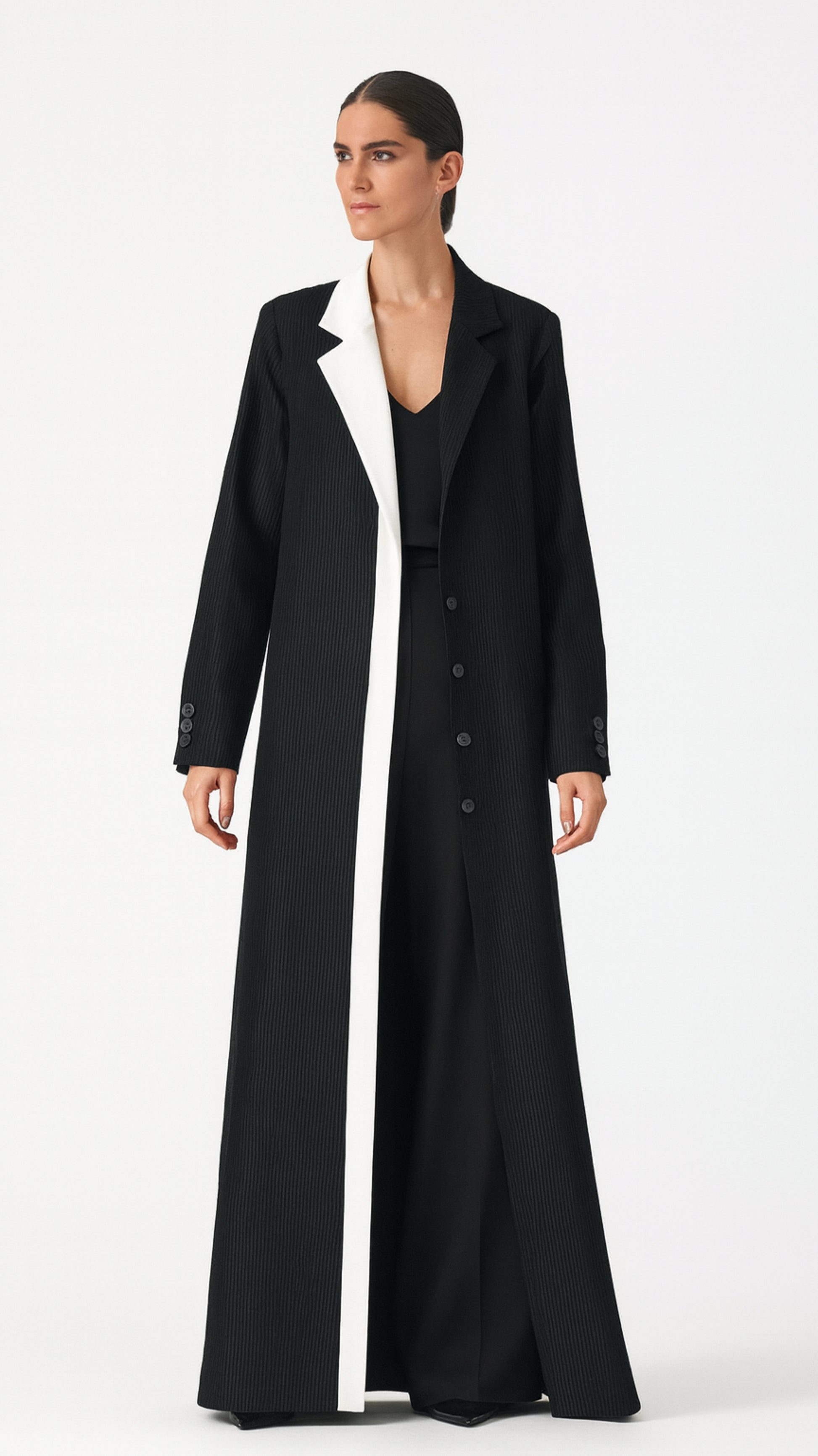 Bold, refined, and impeccably tailored — the Monochrome Contrast Blazer Abaya is a statement piece for the woman who embraces confidence with elegance. Designed in a structured blazer cut, this full-length abaya features a sleek black base accented by a striking white asymmetric lapel and front panel, creating a sharp, modern contrast.
