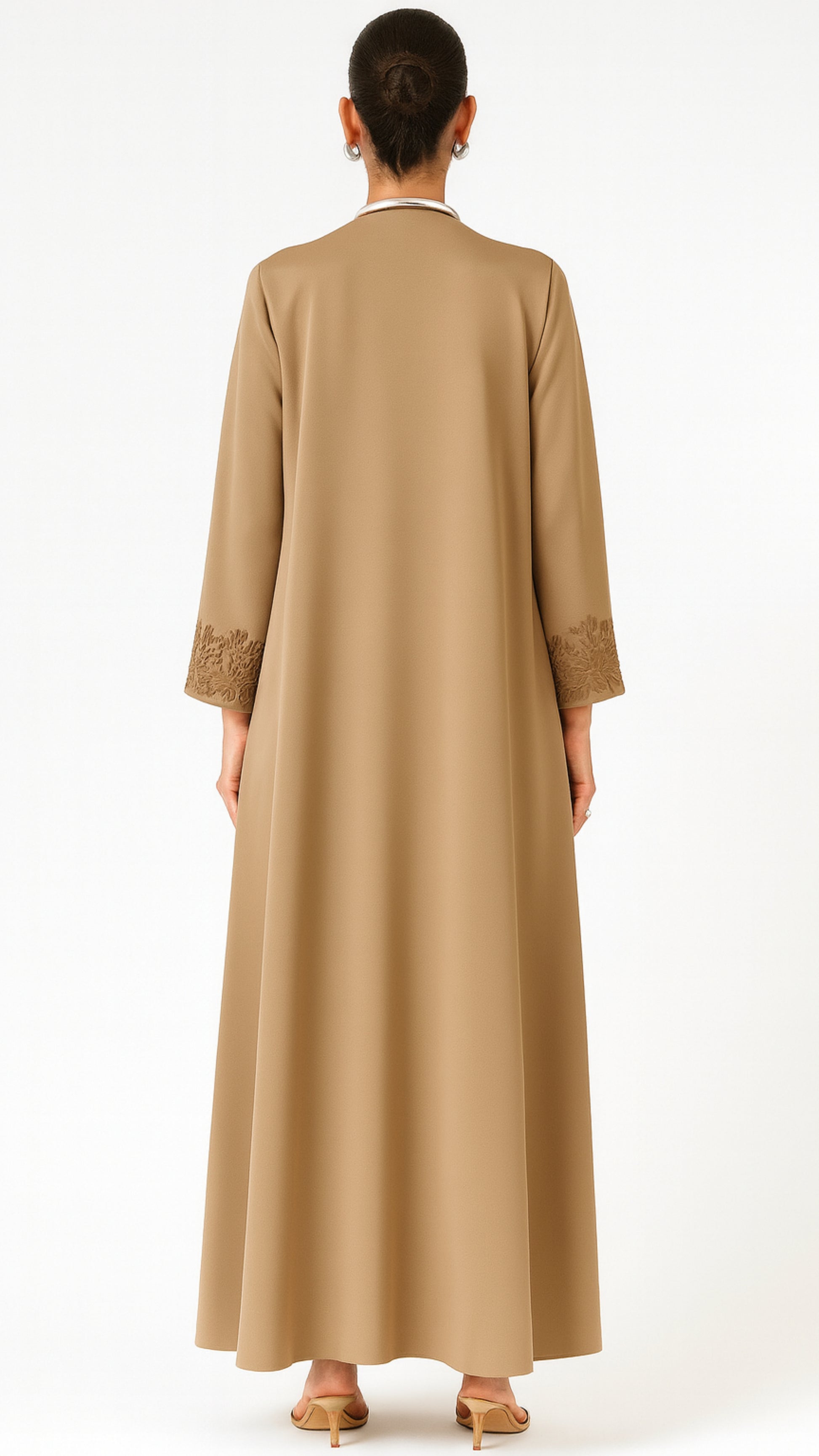 Exude sophistication and timeless appeal with the Camel Dusk Open Abaya, a refined piece designed for effortless elegance. The straight-cut silhouette drapes gracefully, creating a sleek, elongating effect that complements all body types.