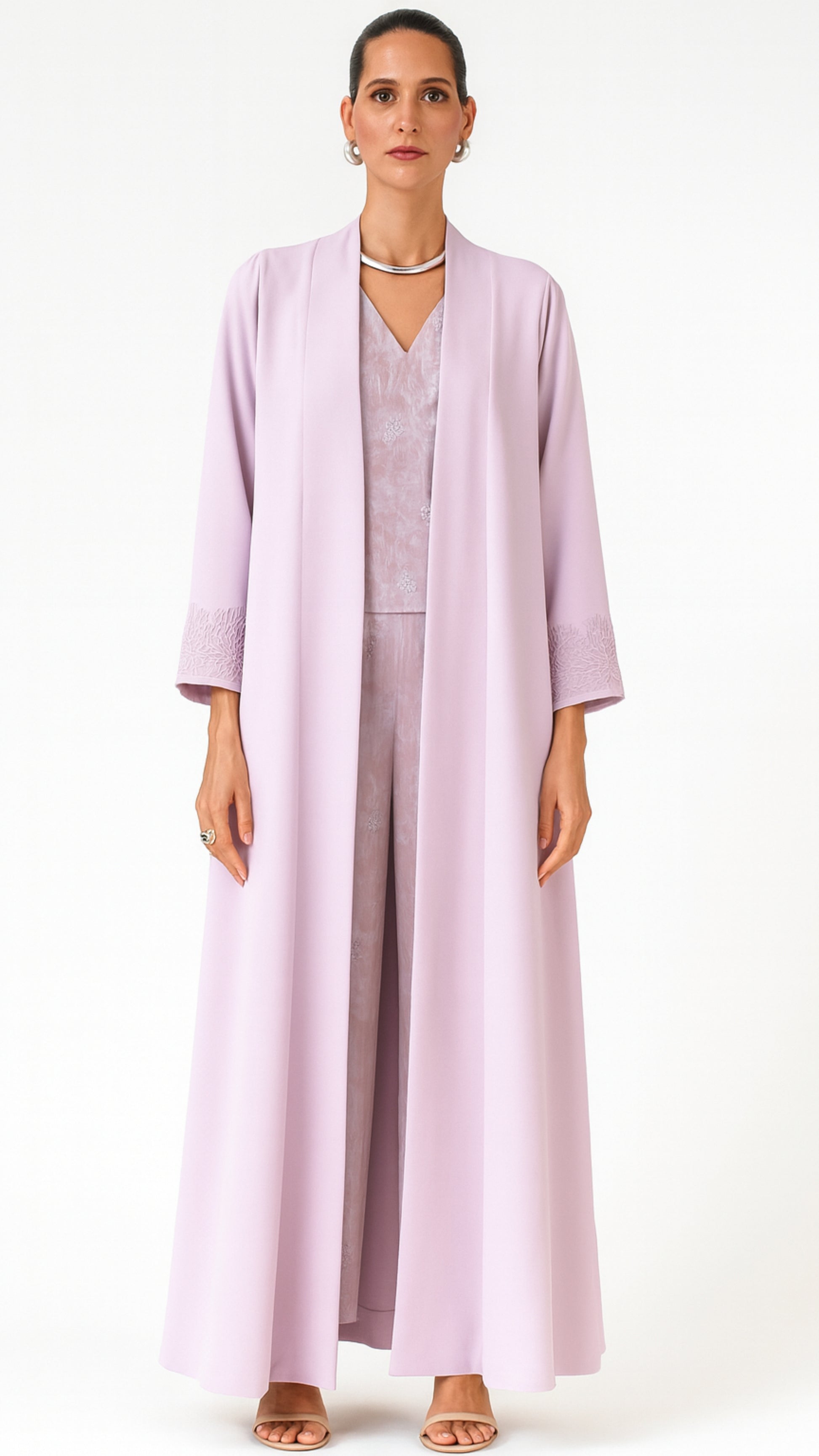 Crafted from premium lightweight crepe, the fabric offers a fluid drape that moves effortlessly with every step. The open-front design showcases a fully coordinated matching inner set in a delicate, textured fabric, achieving a harmonious monochromatic blush purple ensemble.