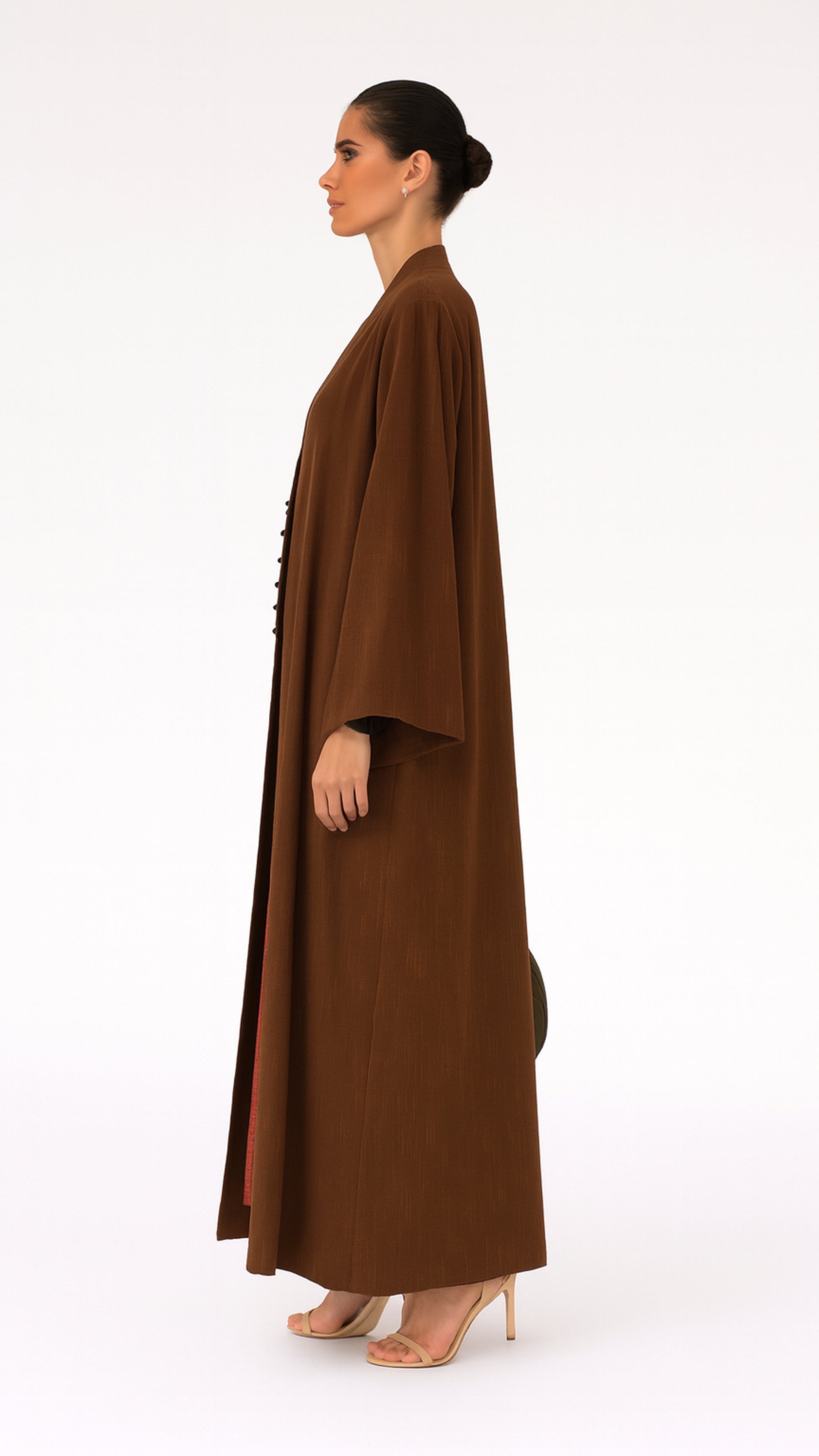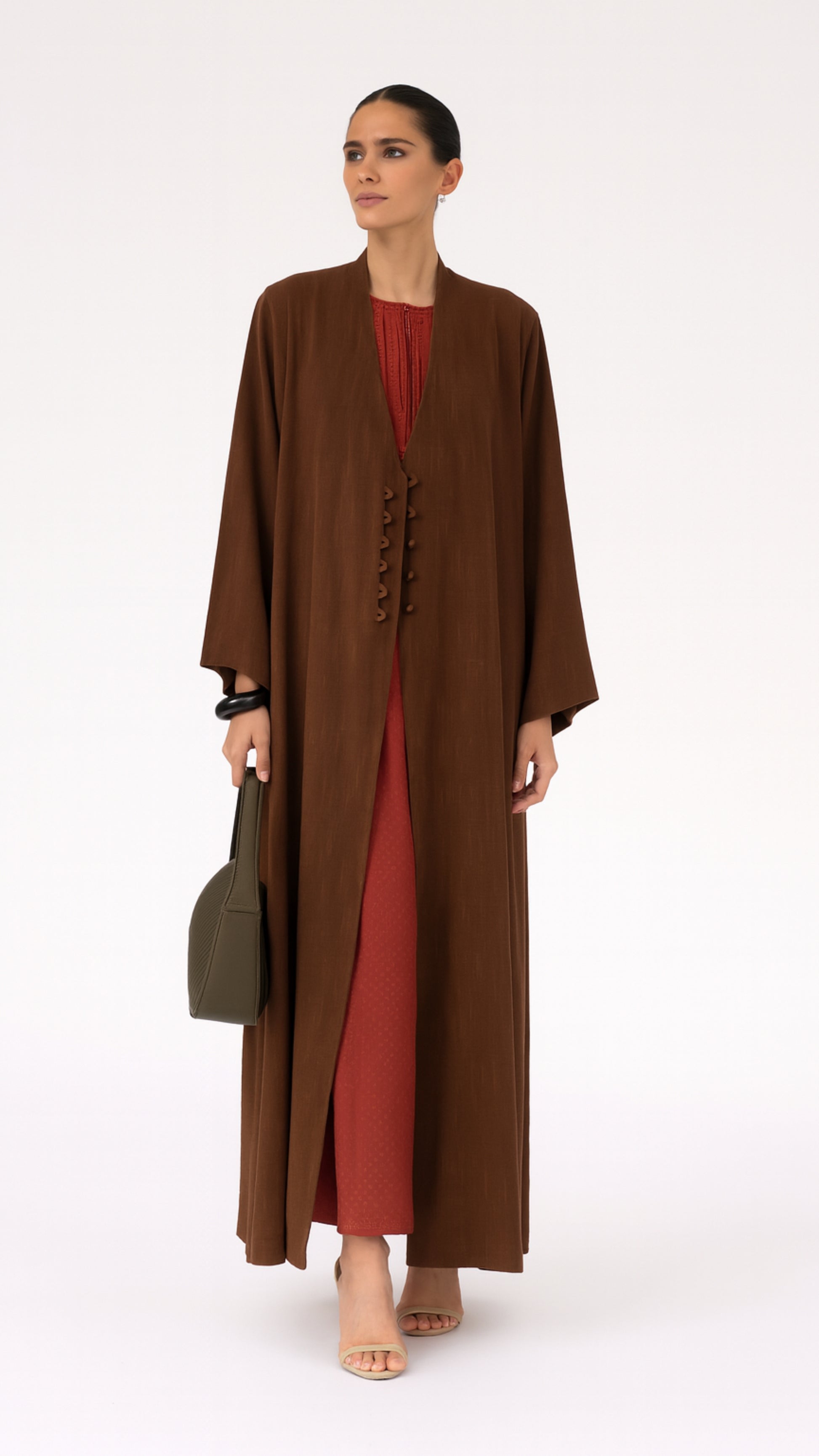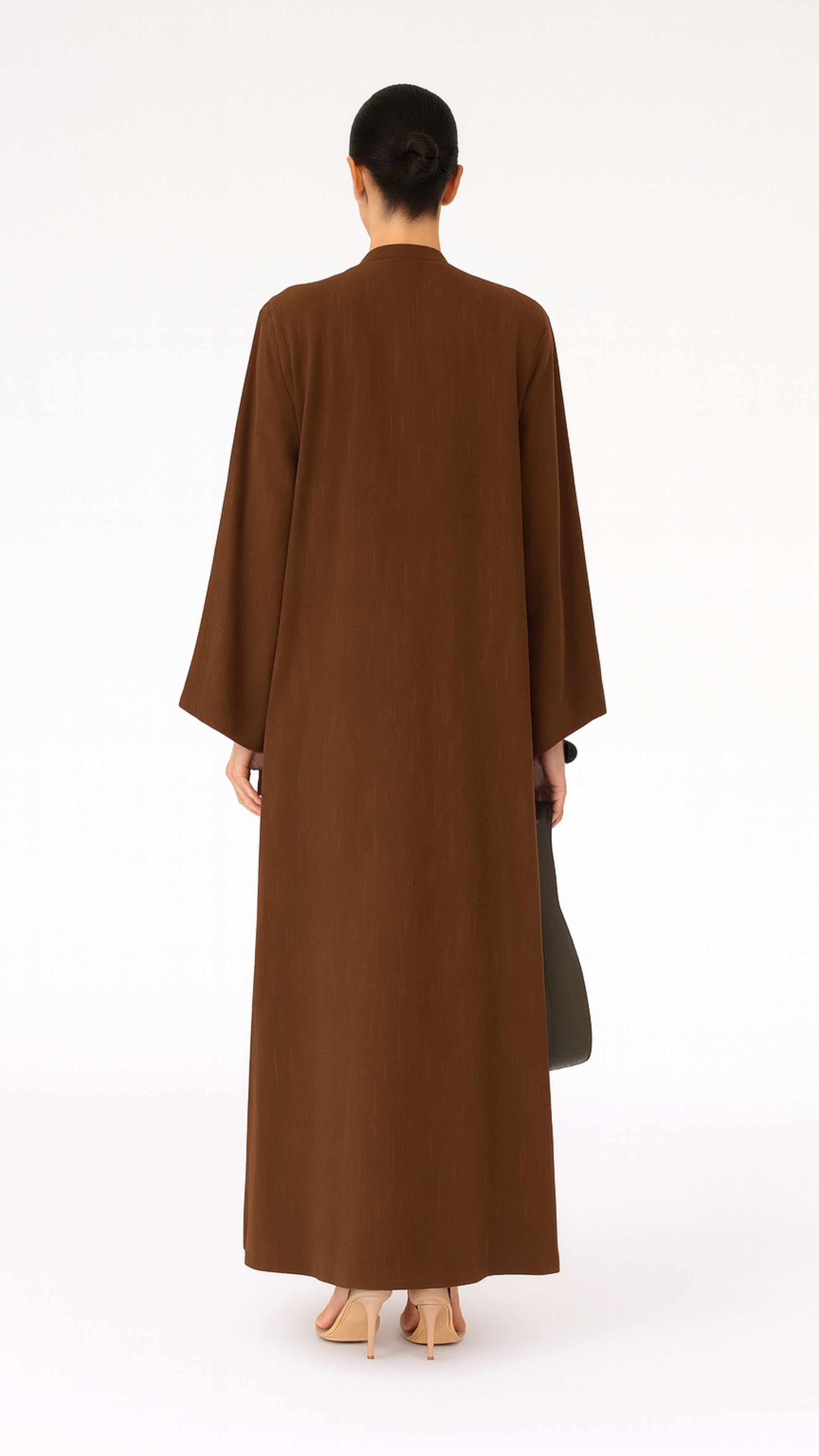 Timeless and versatile — the Cocoa Classic Abaya is designed for women who appreciate understated elegance. Its deep cocoa brown shade, paired with its simple yet refined button-down front, makes it an essential piece for both casual and elevated outings. With a relaxed cut and flowy fabric, it offers effortless grace without compromising comfort.