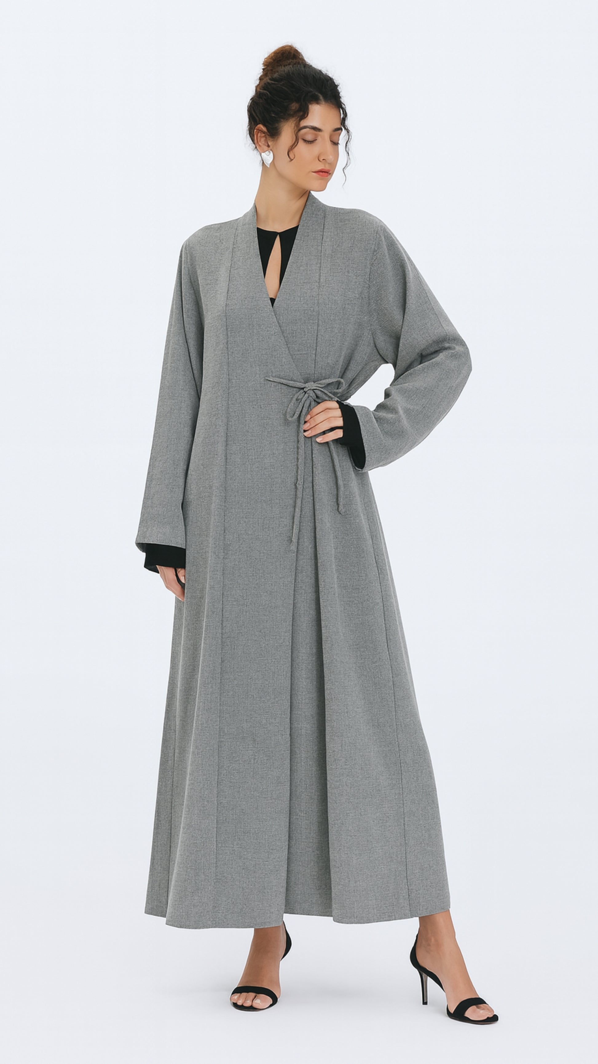 Sleek minimalism meets contemporary tailoring in the Grey Tie-Waist Abaya. Its clean lines and subtle structure offer a polished look, while the adjustable waist tie allows for a flattering, customizable fit. The understated grey tone makes it versatile and timeless — ideal for professional settings, casual chic days, and elevated evening wear.