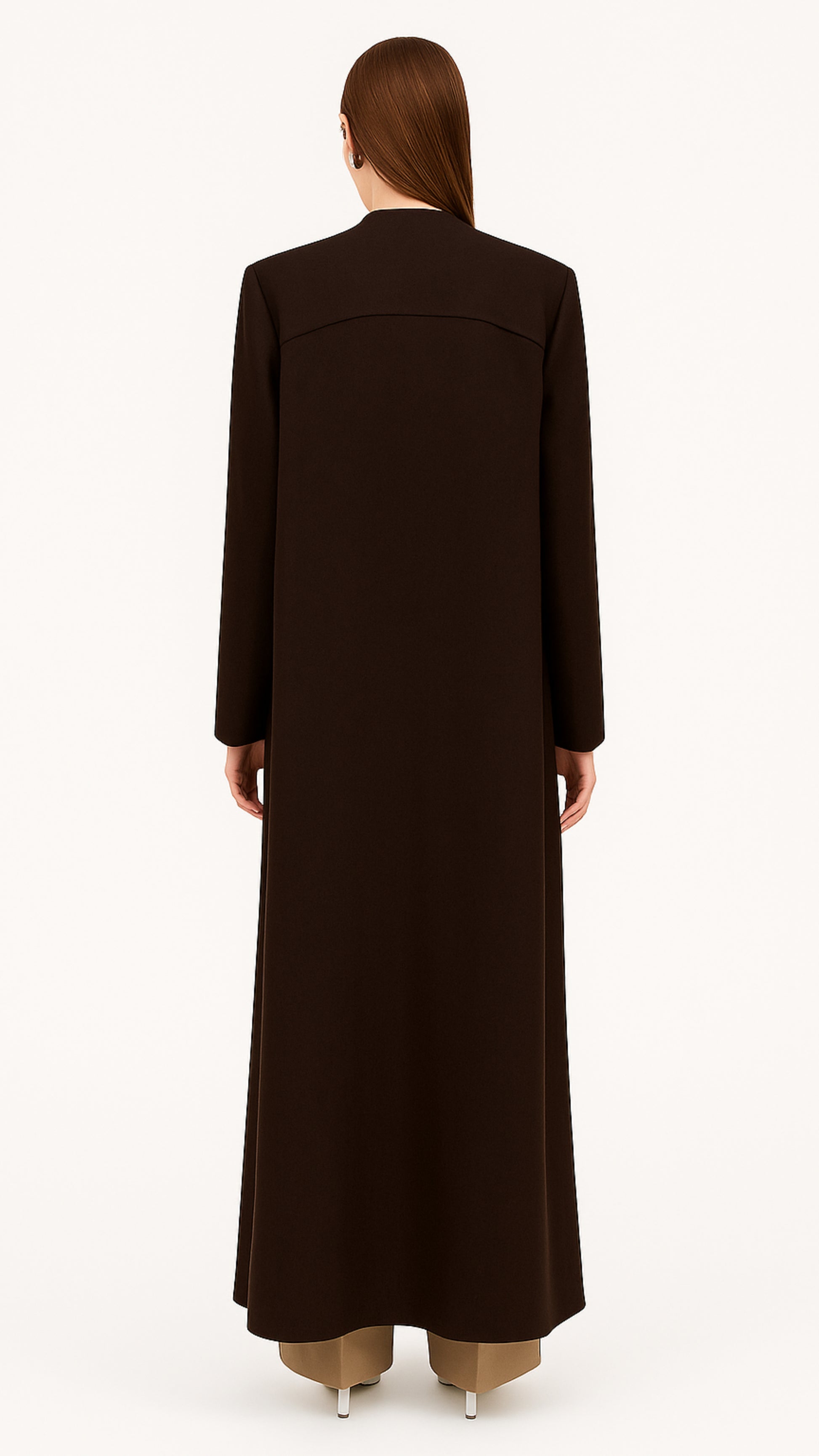 Refined structure meets fluid form in this Sculpted Seam Abaya in deep brown. Tailored with subtle architectural detail across the front and back yoke, this piece adds quiet drama to a timeless silhouette.